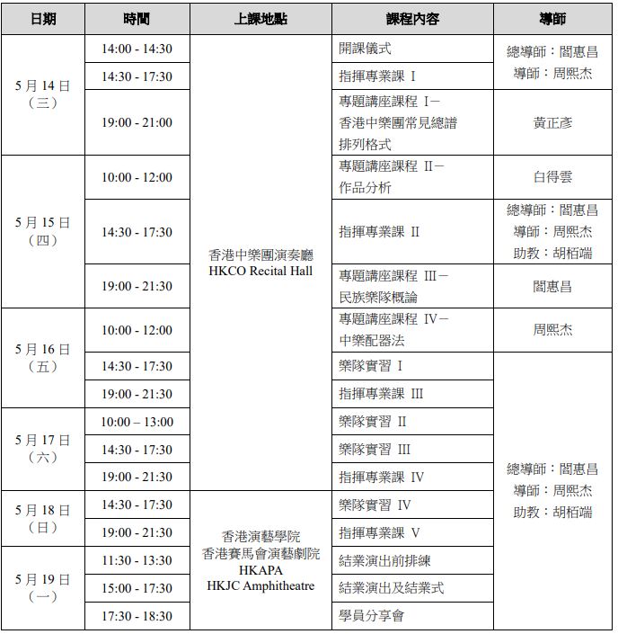 由閻惠昌教授(總導師)及周熙杰先生(導師)親自授課、助理指揮兼香港青少年中樂團常任指揮胡栢端先生擔任助教,以大課形式進行,正式學員單獨輪流在指揮台演習所選作品,接受教授直接指導。